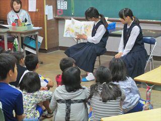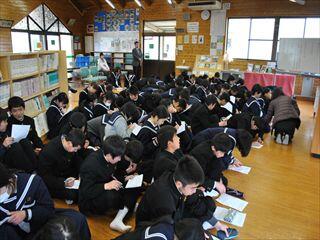 第2回目の小学生への読み聞かせは、1・2年生で、各学級からそれぞれ4名ずつ計16名で実施しました。初めての生徒が多かったので、昼休みの時間を使って練習し、当日に臨みました。最初はやや緊張気味だった生徒もすぐ雰囲気に慣れて、小学生といい雰囲気で頑張っていました。終わった後の生徒の達成感・満足感が笑顔にあふれていました。アンケートをとりましたが、[とてもよかった][機会があれがしてみたい]という感想がほとんどでした。次回もぜび積極的な参加をお願いします。