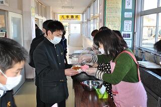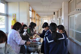 2月14日(土)は、最後の参観授業でした。この日のお昼は、学年役員さんに勝(カツ)カレーを準備していただきました。とっても美味しいえびの米のご飯やお肉、手作りの色々な種類のお漬け物もあり、幸せそうな顔をしておかわりをする生徒も多かったです。何よりも保護者の方々の愛情でお腹がいっぱいになりました。食べた後の子どもたちの感想は、保護者の方々への感謝の気持ちや入試に向けてさらに頑張っていこうという熱い気持ちでいっぱいでした。県立高校一般入試まで、あと僅かとなりました。学校でも家庭でも全力を尽くすだけです。