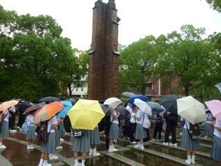 7月6日(日)、加久藤中学校第2学年46名全員元気良く修学旅行がスタートしました。本日は、長崎に行き平和公園で「平和への祈りの集会」を行いました。続いて、原爆資料館を見学し、被爆者の方の体験談をお聞きしました。雨の中で傘を差しながらの「平和への祈りの集会」でしたが、真剣な態度でしっかりと取り組めていました。