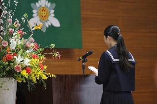 送辞は、生徒会長の2年2組 北田莉桜さんが述べてくれました。
