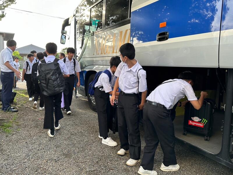 7月3日(水)2年生が楽しみにしていた修学旅行がいよいよスタートしました。朝6時30分から開始の出発式に参加生徒が全員集合し、楽しみの中にも緊張した表情の生徒の姿が見られました。校長先生、添乗員の方、学年主任の先生の話を聞いた後、見送りにきてもらった保護者の方々に、少し恥ずかしそうに「いってきます」と声をかけ、バスに乗り込みました。これから3日間の旅で、2年生が何を思い、何を感じるのか・・・。今日から3日間、随時ホームページを更新し、旅の様子をアップしますので、時間がありましたらHPをご覧になってください!
