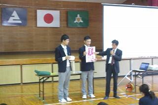 留学生は中国に関するクイズを通して中国の紹介をし、中学生は加久藤中学校について学校行事や生徒会について紹介しました。