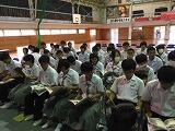 今回の避難訓練は、火山の噴火を想定したもので、空振や噴石などに対する対応を学習し、実際に各教室で避難行動を練習した後、体育館に移動し講師としてお招きしたえびの市役所基地・対策防災課の方のご講和を聞きました。