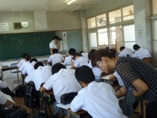 8月31日(月)  加久藤小学校の6年生が中学校にきて中学校の先生から授業を受けるという【体験授業】を実施しました。これは小中連携の1つで、中学校で1日授業を受けさせることで中学校の雰囲気にふれることと、中学校生徒との交流活動を通して中学生への親近感をもたせることをねらいとしています。
