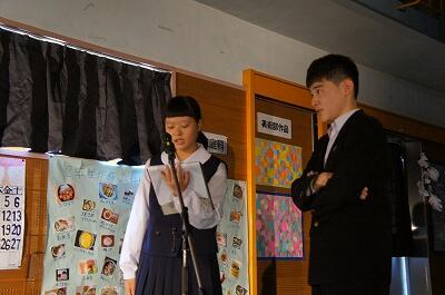 留学生は中国に関するクイズを通して中国の紹介をし、中学生は加久藤中学校について学校行事や生徒会について紹介しました。