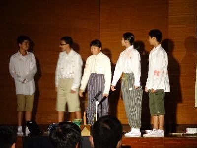 2年生の発表は、修学旅行で学んだことの発表と、平和を願う戦争劇でした。いつもの2年生とは違う雰囲気で、戦争の悲惨さ・平和の大切さを訴えてくれました。