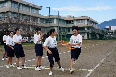 持久走の後は、クラス対抗の駅伝大会です。最初に1年の2クラスが飛び出し、1年1組が終盤までリードしましたが、最終の6区で2年生が意地を見せ、逆転で2年2組が優勝のゴールテープを切りました。駅伝に出場した選手の皆さんは、さすがにクラスの代表とあって、全員が素晴らしい走りをみせていました。