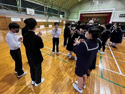 次に、全校生徒を班に分けて、生徒会役員を中心に企画したレクリエーションをおこないました。今年度は、「ジェスチャー伝言ゲーム」を実施しました。ことばを使わずに伝える難しさを感じたことと思います。
