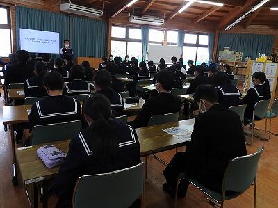 全校生徒が集まる中、えびの警察署長から、交通事故等の現状の説明や手上げ横断の効果等についてお話がありました。