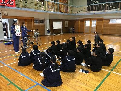 えびの高原ドライビングスクールとえびの警察署、えびの交通安全協会から講師をお招きし、主に自転車に関する交通マナーや自転車の点検の仕方について勉強しました。自転車シミュレーターを使った訓練や「ぶたはしゃべる」の合い言葉を使った点検方法の説明などに対し、生徒は集中して取り組むことができていました。
