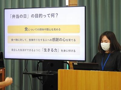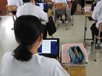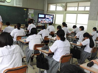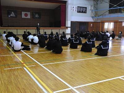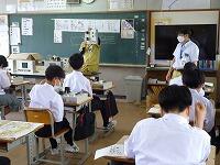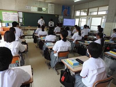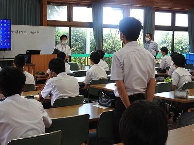真幸地区に住まわれているボランティアの方の講話を、3年生の生徒が対面で、1,2年生はオンラインで聞きました。