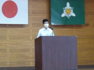 最初に、各部の決意発表がありました。その後、生徒会代表、校長からの激励の言葉に続き、選手を代表して陸上部のキャプテンが力強く選手宣誓を行いました。最後に、全員で校歌を斉唱して、激励会が終わりました。