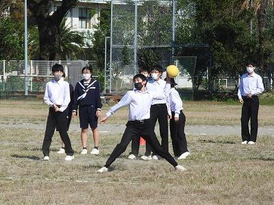 全校生徒が6つのチームに分かれて、違うチームと2回、対戦しました。風が強く、ボールが軽かったため、狙いを定めるのに苦労しましたが、みんな和気あいあい、笑い声が響いた中で遊んでいました。