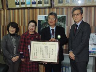 12月17日(水)、校長室において「第34回全国中学生人権作文コンクール」の感謝状を伝達していただきました。これは、本校が、法務省および全国人権擁護委員連合会主催の「全国中学生人権作文コンクール」に全校をあげて取り組んでいることに対して贈られたものです。宮崎地方法務局都城支局と都城人権擁護委員協議会より計4名の皆様がお見えになりました。今後とも、人権教育に更に積極的に取り組んでいきたいと考えています。