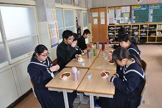 2月14日(土)は、最後の参観授業でした。この日のお昼は、学年役員さんに勝(カツ)カレーを準備していただきました。とっても美味しいえびの米のご飯やお肉、手作りの色々な種類のお漬け物もあり、幸せそうな顔をしておかわりをする生徒も多かったです。何よりも保護者の方々の愛情でお腹がいっぱいになりました。食べた後の子どもたちの感想は、保護者の方々への感謝の気持ちや入試に向けてさらに頑張っていこうという熱い気持ちでいっぱいでした。県立高校一般入試まで、あと僅かとなりました。学校でも家庭でも全力を尽くすだけです。