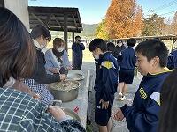 12月7日(土)駅伝ロードレース大会の後、お母さん方が朝から準備してもらった豚汁が振る舞われました。朝早くに集まってもらい、頑張った生徒のみなさんのために一生懸命作ってもらいました。午前中、一生懸命走り、また、仲間を応援したので皆さんお腹はペコペコで、おかわりをする生徒も続出でした。本当においしい豚汁をありがとうございました。