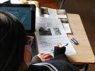 授業では、デジタル教科書も使いながら、インプット・アウトプットを意識した活動的な授業が展開されました。少し内容理解で難しい部分もありましたが、テンポのよい授業で全員がしっかりと取り組めていました。