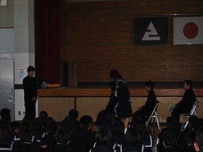 4月15日(水)新入生を対象に、対面式・歓迎行事が行われました。これからの中学校生活が充実したものになるよう、各委員会の取組や学校生活のルールなどについて劇を交えながら分かりやすく説明されました。その後は、部活動紹介が行われ、練習内容や演奏など様々な紹介があり、新入生も充実した時間を過ごせたようです。