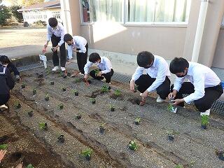 11月29日(月)、学級専門委員会・全校専門委員会が行われました。6時間目の全校専門委員会にはクラスの代表が出席します。委員会に出席しない生徒たちはいろいろな取組を行いますが、今回は花壇の花植えと学校前の歩道の清掃を行いました。