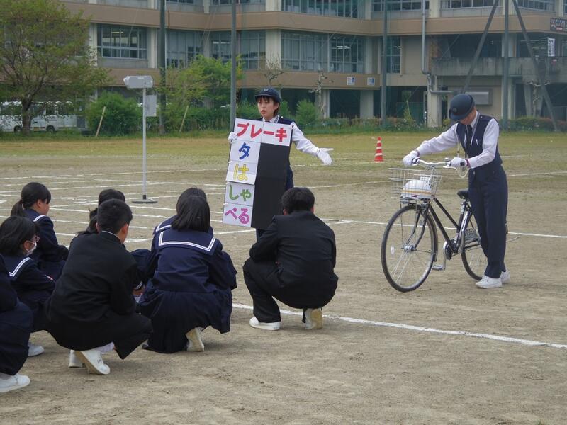 今年は運動場で、自転車点検の方法や実技の指導をしていただきました。丁寧に熱心に指導をしていただき、生徒は緊張しながらも真剣に指導を受けながら、交通安全に対する知識・技能・態度を育てることができたと思います。