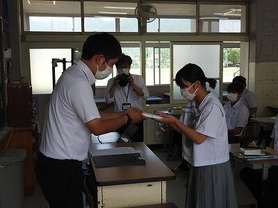 商工会青年部の2名の方が本校にお越しくださり、3年生に経済のこと、田の神さあ商品券のしくみ等について説明をされた後、代表の生徒に「田の神さあ商品券」を贈呈してくださいました。