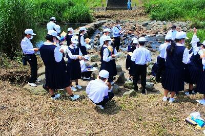 6月3日(金)、1年生が、3,4校時に総合的な学習の時間「えびの学」で水生生物調査を実施しました。