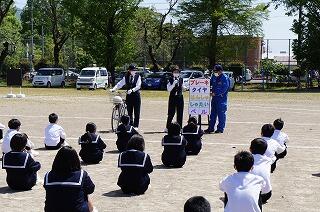 4月22日(木)に全学年を対象とした交通安全教室を実施しました。えびの市交通安全協会から2名、えびの警察署から2名の方に来ていただきました。