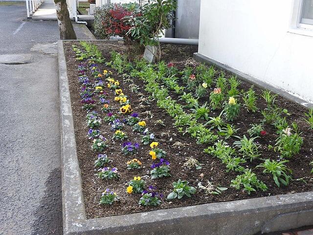 事務室前の花壇は、まちづくり協議会からいただいた花できれいになりました。(正月にむけて準備万端整いました。)