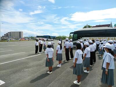 出発式では、実行委員長から「スローガンを守って、思い出に残る修学旅行にしましょう。」と話がありました。