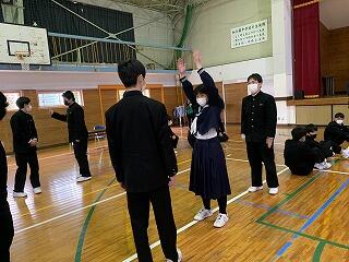 3月9日(火)3校時~6校時にかけて、生徒会主催の3年生送別行事と球技大会が行われました。3校時の送別行事では、まず、1年間お世話になった、美術の堀田先生とのお別れ会が行われ、その後、ジェスチャーゲームと○×ゲームが行われました。ジェスチャーゲームは、全校生徒がバランスよく10グループに分かれ、まず先頭の人がお題を確認し、それを列の後方の人にジェスチャーだけで伝えていき、最後の人が解答を書くというものです。みんな身振り手振りで必死に相手に伝える姿が、何ともユニークでした。なかなか難しそうですが、正解を出す班も意外に多く、大いに盛り上がっていました。次の○×ゲームも加久藤中学校に関する難問が多く、最初の問題で半分の人が脱落してしまいました。最後はたった1人だけが正解し、こちらも大盛り上がりでした。