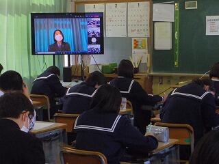 当初予定していた体育館での開催からオンライン形式に変更して実施しました。卒業生と1,2年生が直接ふれあうことはできませんでしたが、画面を通して、卒業生の体験や通っている高校の説明を聞いたり、質問をしたりしました。