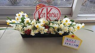 水仙と推薦をかけた花飾りに、入試に向かう3年生に対しての激励が込められています。