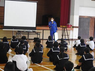 最初に、自転車の乗り方に関するDVDを視聴した後、交通安全協会の指導員の方から、自転車の点検の仕方等について話していただきました。昨年度もお話があり、点検時には「ブタはしゃべる!」を意識して点検することを確認しました。その後、えびの警察の方からは、昨年4月から施行された宮崎県自転車条例について話がありました。特に、自転車保険の加入については義務となっているので、しっかりと確認しておく必要があります。