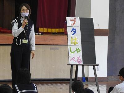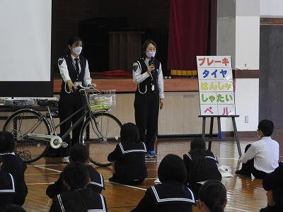最初に、自転車の乗り方に関するDVDを視聴した後、交通安全協会の指導員の方から、自転車の点検の仕方等について話していただきました。昨年度もお話があり、点検時には「ブタはしゃべる!」を意識して点検することを確認しました。その後、えびの警察の方からは、昨年4月から施行された宮崎県自転車条例について話がありました。特に、自転車保険の加入については義務となっているので、しっかりと確認しておく必要があります。