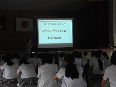 また、6時間目は生徒のみで「薬物乱用防止教室」を行いました。学校薬剤師の先生に講師をお願いし、昨年度に引き続いての開催となりました。
