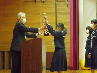 その後、11月7日に大分県で行われた、全日本マーチングバンド九州予選で金賞を獲得し、全国大会に推薦された吹奏楽部からトロフィーと表彰状の校納がありました。