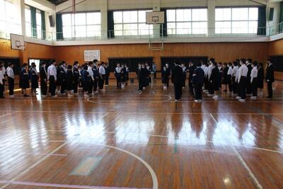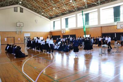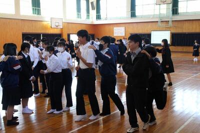 まず、生徒会役員が、1年生は果物の名前を、2年生は動物の名前を、3年生は文房具の名前を提示し、各学年の生徒で、その名前の文字数の人で集まるというものでした。