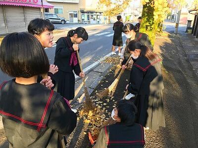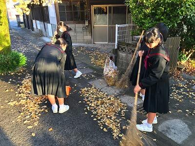 放課後、落ち葉を1年生がボランティアで掃き集めてくれ、歩道がきれいになりました。