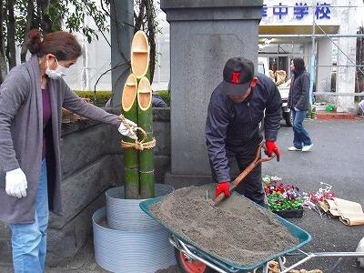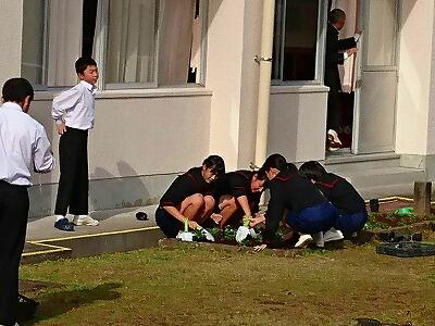 中庭では、花壇の草花の植え替え(パンジー)が行われていました。