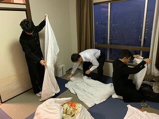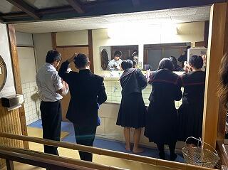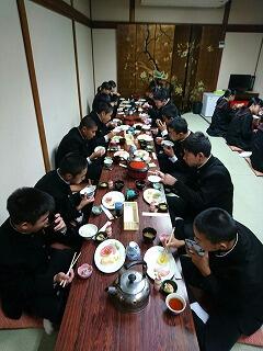 食後に修学旅行最後の夕べの会を行いました。班ごとに今日の反省や明日の目標を発表しました。