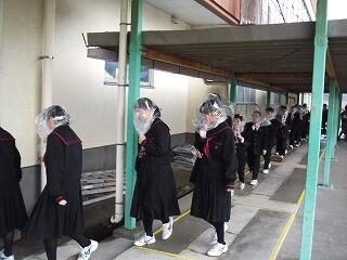12月17日(火)、理科室から出火したという想定で火災の避難訓練を実施しました。雨天であったため、体育館に避難しましたが、今回は一酸化炭素等の有毒ガスから身を守るためにビニール袋をかぶっての避難を試してみました。講評の中でえびの消防署員の方からもいい試みなので続けて欲しいとお褒めの言葉をいただきました。