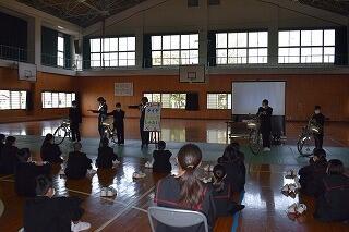6月25日(火)にえびの市文化センター文化事業の一環として全楽年生を対象に実施しました。Rue de Valse(ルードバルス)というグループの方々3名に、アコーディオン、ギター、クラリネトによる軽快な演奏を披露していただきました。初めて聞く曲やジブリの曲などすべての曲がわずか3種類の楽器でしかも目の前で演奏されていることに生徒たちは大興奮でした。