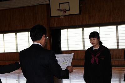 その後、教頭先生が、全国大会に出場する「空手競技」、そして本校で行われた学力向上コンテストの表彰を行いました。
