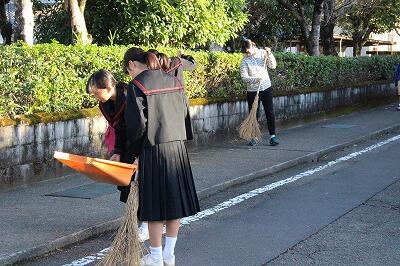 その霧の中、バスケットボール部とソフトボール部がホーキとちり取りを持って駅方面に向かいました。
