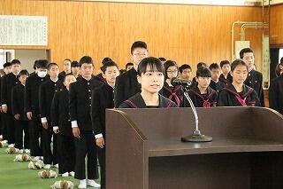 その後、「始業式」に入り、3年生代表が、最後の中体連の大会に向けて、また、中学校最後の難関である受験に向けて新年度の抱負を述べました。