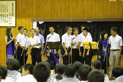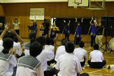 ステージでは、Whoopinnさんの歌はもちろん、3年生や先生方も一緒になって歌ったり、全校で歌ったりするシーンがありました。