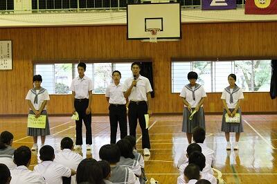最初に夏休み作品展の表彰、県総合体育大会の表彰を行いました。
