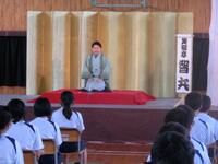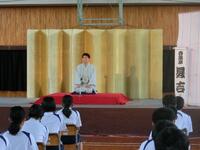 太神楽師 丸一仙三さんの曲芸、上方落語家 笑福亭智丸さんの落語「動物園」、江戸落語家 春風亭昇吉さんの落語「桃太郎」と本物の落語に触れることができたことはもちろん、代表の生徒が、大勢の人前で発表できた貴重な鑑賞教室となりました。