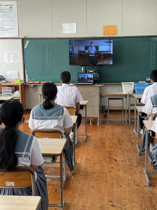 薬物乱用防止教室は全校生徒対象であるため昨年度までは体育館で行っていましたが、今年度は暑さ・感染症対策のために、3年生は会議室で講師の先生の話を直接聞き、1,2年生は各教室でその様子をZOOM配信で参観するという一部リモート開催としました。このような形態での授業は初めてのために準備が多少手こずりましたが、職員で試行錯誤しながら何とか本番を迎えました。性能のよいWEBマイクがなく音声が多少聞き取りづらかったですが、何とか大きなトラブルもなく無事に授業を終えました。今後もこのような授業の工夫を積極的に行って行きます。