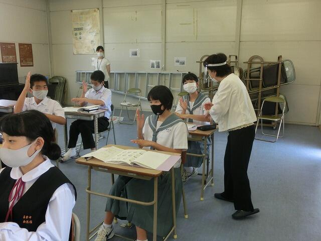 えびの市手話言語条例など手話についてのお話をしていただいたあと、実際に自分の名前やあいさつの仕方を学びました。「山」であれば山をイメージした手話になっており、イメージと結びつけながら、手話を学習していました。最後には、手話を交えて「365日の紙飛行機」をみんなで歌いました。講座のあとの質疑応答では、「耳が聞こえないことにより、普段の生活で困ることはありませんか?」など、生徒たちの積極的に質問する姿がありました。これからの福祉学習につながりそうです。
